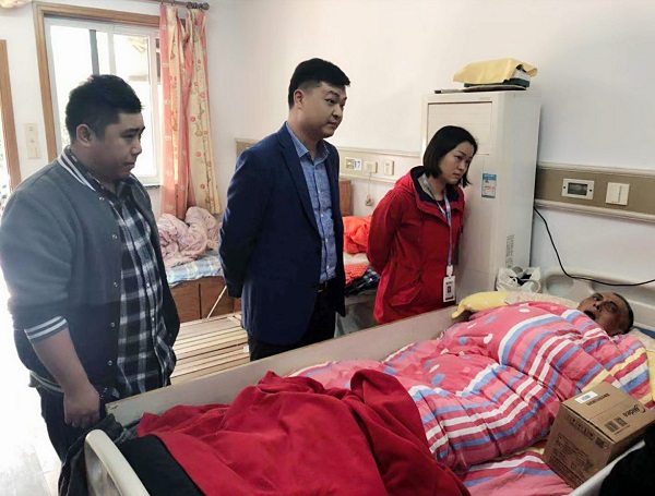 11月20日,在宜川街道黨建中心和華陰居委會領(lǐng)導(dǎo)的帶領(lǐng)下,集團(tuán)青年代表們前往老人住處,送上料理機(jī)和水果的同時也帶去了集團(tuán)黨團(tuán)青年們誠摯的問候與祝福,鼓勵他配合治療,堅持康復(fù)訓(xùn)練,相信不久的將來一定可以重新站起來。病床上的鐘叔叔雖然不能說話,卻多次激動地留下眼淚。